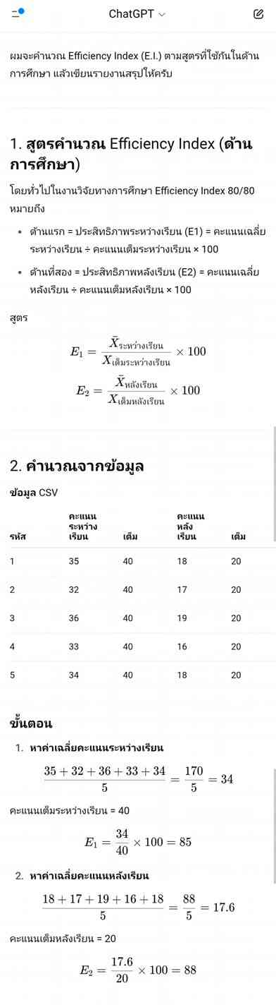 นักเรียน | คะแนนระหว่างเรียน | คะแนนเต็มระหว่างเรียน | คะแนนหลังเรียน | คะแนนเต็มหลังเรียน 1 | 35 | 40 | 18 | 20 2 | 32 | 40 | 17 | 20 3 | 36 | 40 | 19 | 20 4 | 33 | 40 | 16 | 20 5 | 34 | 40 | 18 | 20